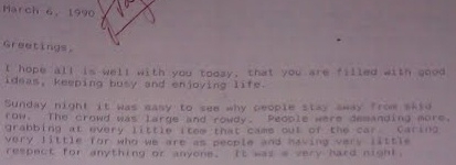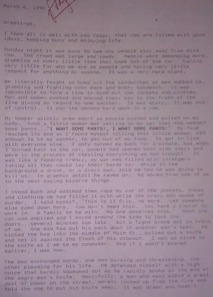 Violence was common in the early years of our work on skidrow. Came across this letter in my desk today and thought I’d share this window into what it could be like in the middle of the night in a place we had yet to earn the trust of people fighting to stay alive. Written in WordPerfect -well before Word- and printed on an old dot-matrix printer connected to an honest to goodness print-spooler… makes me feel old just remembering all that stuff!